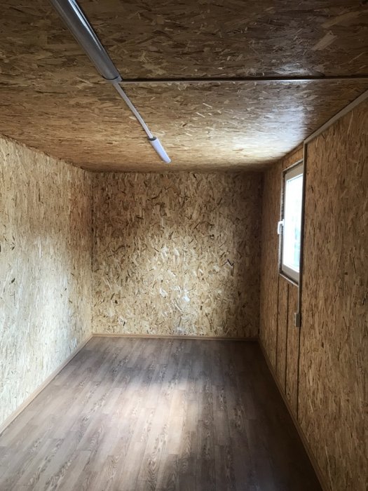 - Бытовки с отделкой ОСБ панелями. ОСБ (ориентированно-стружечная плита) — практичный материал для внутренней отделки бытовок на строительных объектах. В отличие от ПВХ-панелей, ОСБ не боится механических повреждений, на стены можно крепить полки, вешать инструмент, прибивать крючки без опасений повредить отделку.