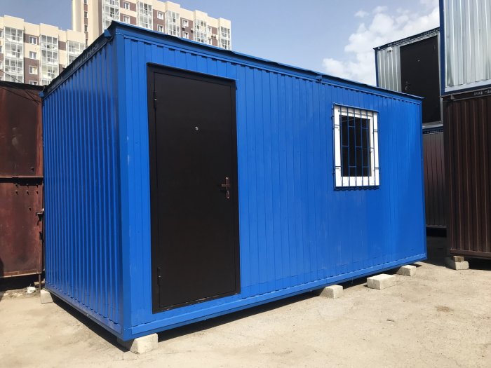 Бытовка металлическая, синий профлист с размерами 5.0x2.4x2.5 м. Внутренняя отделка выполнена из МДФ, внешняя - Цветной. Бытовка оснащена 1 шт. окнами/окном и дверью. Термоизоляция и гидроизоляция бытовки состоит из: Полиэтиленовая пленка 100 мкм. и Минеральная вата KNAUF 50 мм., что позволяет сохранять приемлемую температуру в помещении. Срок гарантии составляет: 6 мес. Страна производства - .