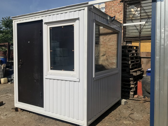 Пост охраны, кпп с большими окнами с размерами 2.4x2.4x2.5 м. Внутренняя отделка выполнена из МДФ, внешняя - Цветной. Бытовка оснащена 3 шт. окнами/окном и дверью. Термоизоляция и гидроизоляция бытовки состоит из: Полиэтиленовая пленка 100 мкм. и KNAUF Insulation Термо 50 мм., что позволяет сохранять приемлемую температуру в помещении. Срок гарантии составляет: 6 мес. Страна производства - .